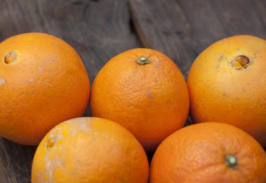 自然栽培に取り組みみ始める20年になる福島さんのネーブル オレンジ特徴はおしりの部分のくぼみがおへそ=ネーブルのように見えること。
