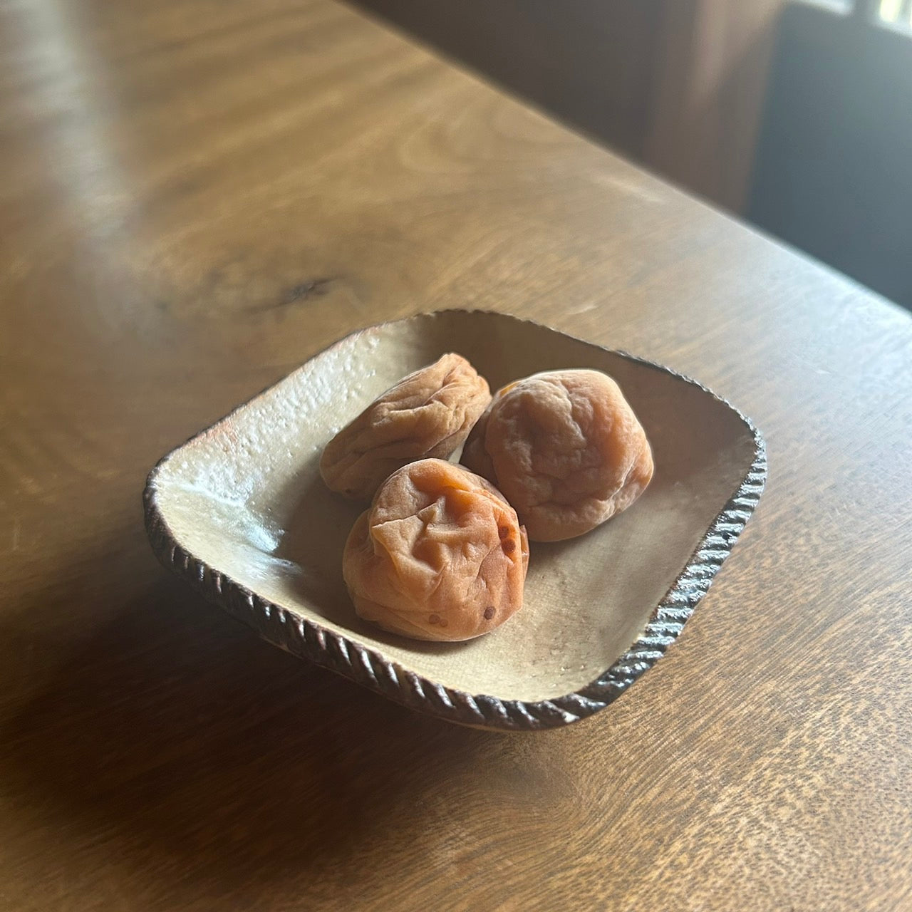自然栽培で育った梅を丁寧に収穫し、塩だけでシンプルに漬け込んだ梅干しです。赤じそを加えていないため、梅そのものの澄んだ酸味と、熟成によって生まれるまろやかな旨みを楽しめます。