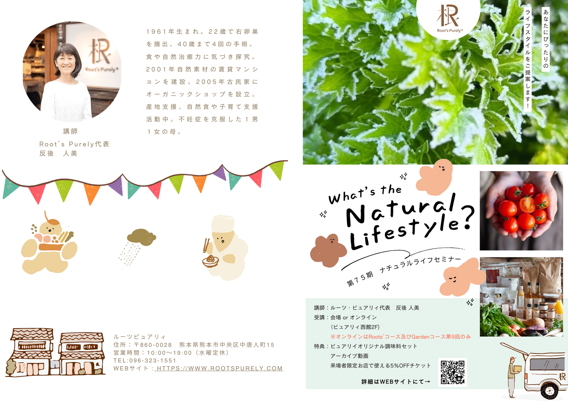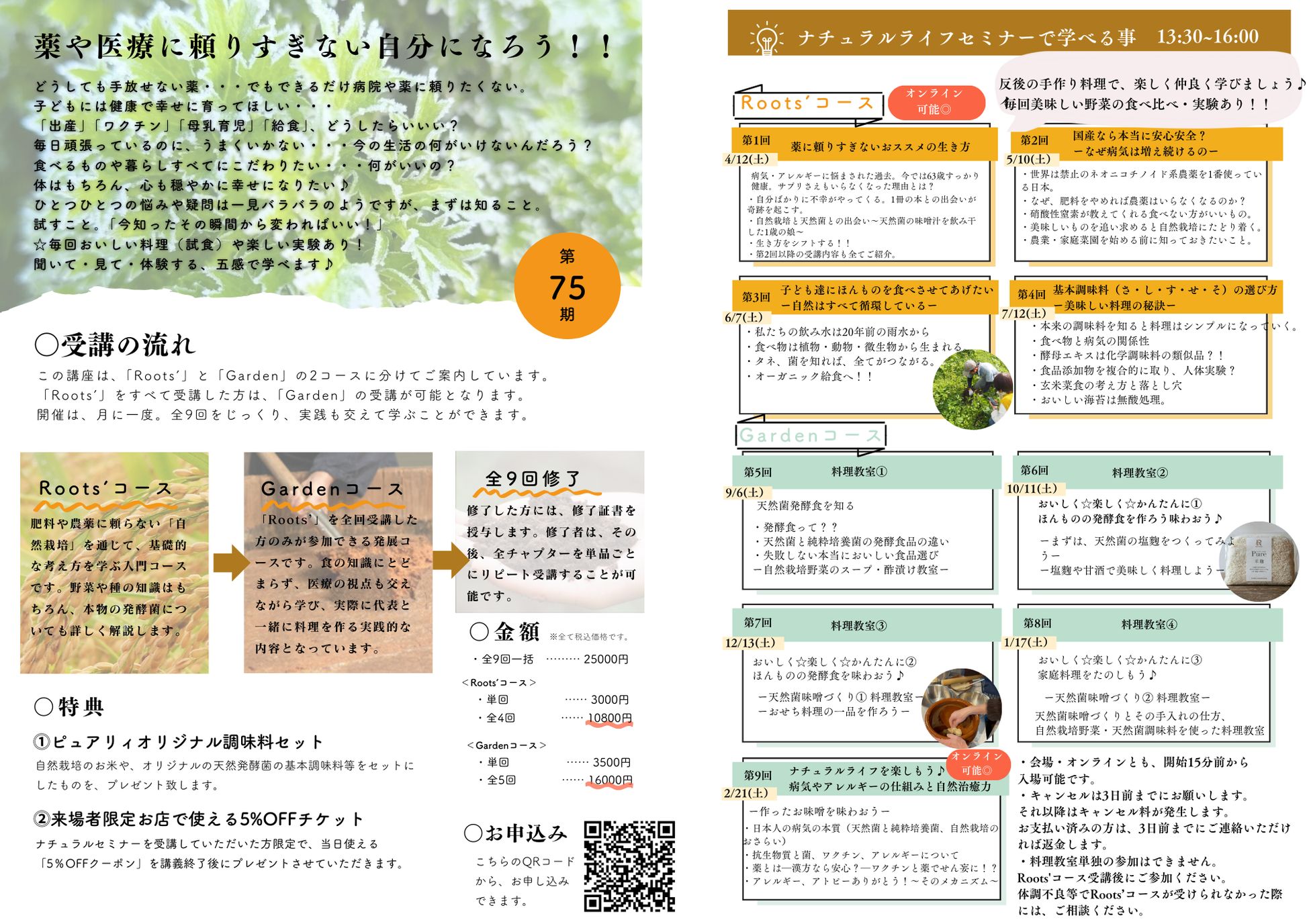 ◎会場・オンラインとも、開始15分前から 入場可能です。 ◎キャンセルは3日前までにお願いします。 それ以降はキャンセル料が発生します。 お支払い済みの方は、3日前までにご連絡いただければ返金します。 ◎料理教室単独の参加はできません。 Roots'コース受講後にご参加ください。 体調不良等でRoots’コースが受けられなかった際には、ご相談ください。